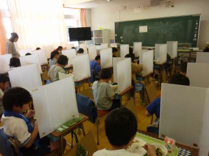 本年度も、パーティションを置き、食事中は、静かにするなどの感染予防をしながら、