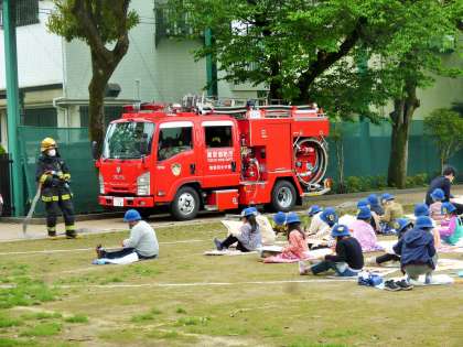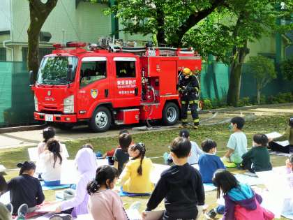 成城消防署烏山出張所から消防車と消防隊員に来校いただき、