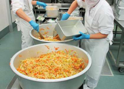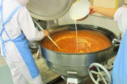 写真は、<ハヤシライス>に生クリームを入れているところと、<コーンサラダ>を配缶しているところです。