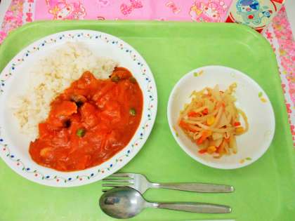今日の給食は、<ハヤシライス>です。給食のハヤシライスのおいしさの秘密は、手作りのブラウンルウとあめ色になるまでじっくり炒めた玉葱にあります。今日も、どの学級もよく食べていました。