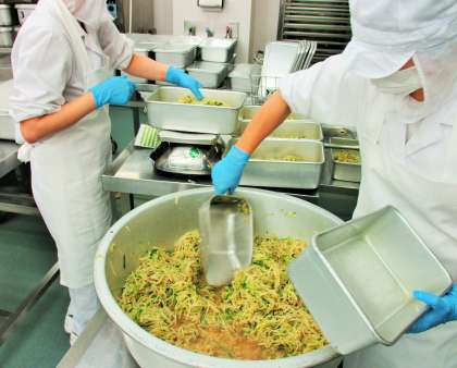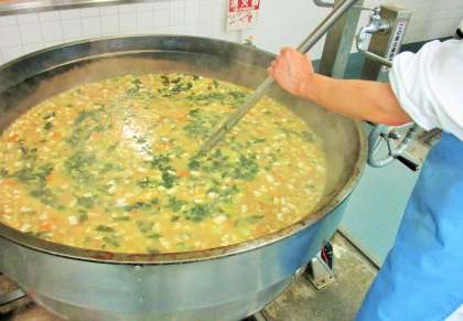 写真は、<もやしのサラダ>を配缶しているところと、<みそ汁>が完成したところです。