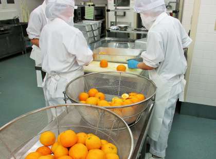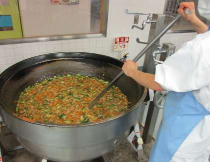 写真は、バレンシアオレンジをカットしている様子と、<中華丼>の具が完成したところです。