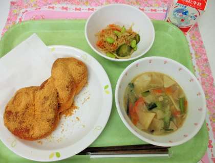 今日の給食は、烏山北小の子どもたちに人気の<きなこ揚げパン>です。外はかりっと、中はふわふわの揚げパンができあがりました。献立表をみて、朝から楽しみに待っていてくれた児童も多かったようです。どの学級も、よく食べていました。