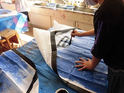 オリジナル法被作りの2回目の様子です。前回色を付けた法被に自分の名前を書き入れました。みんな真剣に作っていました。