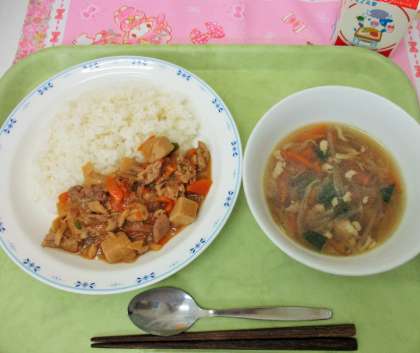 今日の給食は、豚肉・にんにく・たまねぎ・高野豆腐のたくさん入った<スタミナ丼>です。豚肉には、体にたまった疲れのもとを取り除く栄養素が豊富に含まれています。スタミナ丼をもりもり食べて、心も体も元気に過ごしてほしいと思います。