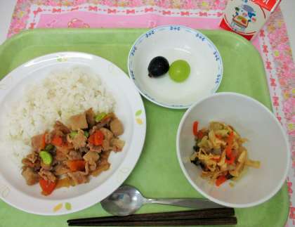 今日のくだものは、ぶどう2種です。9月にひき続き、ぶどうの食べ比べ第2弾です。今日は、巨峰とシャインマスカットを用意しました。ぶどうの主成分であるブドウ糖や果糖は、体に入るとすぐエネルギーに変わるので、疲れをとってくれる働きがあります。旬のぶどうを食べて、今週も元気に過ごしてほしいと思います。