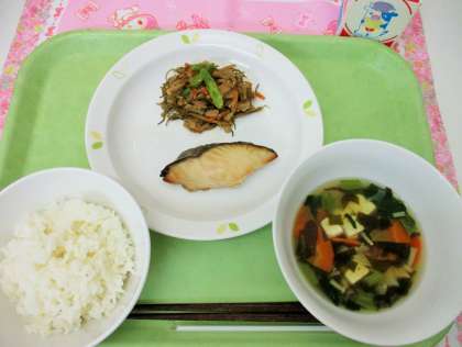 今日の給食の副菜は、<五目きんぴら>です。ごぼう・れんこん・にんじん・切り昆布・豚肉・さやいんげんが入っています。根菜類は、食物せんいが豊富に含まれており、かみごたえもあるので、子どもたちに好きになってほしい食材です。