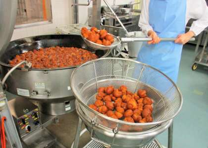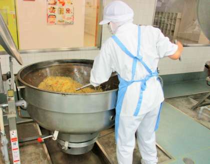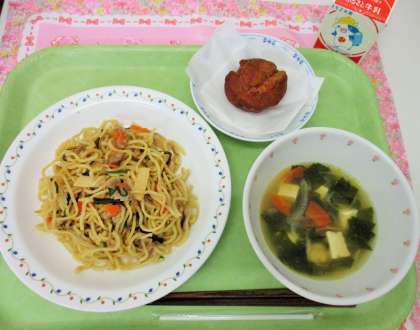 今日の給食のデザートは、沖縄県の揚げ菓子<サーターアンダーギー>です。沖縄の方言で、サーターは「砂糖」、アンダーは「油」、ギーは「揚げる」という意味があるそうです。給食では、沖縄県産の黒砂糖を使い、コクのある素朴な味わいに仕上げました。どの学級も、よく食べていました。