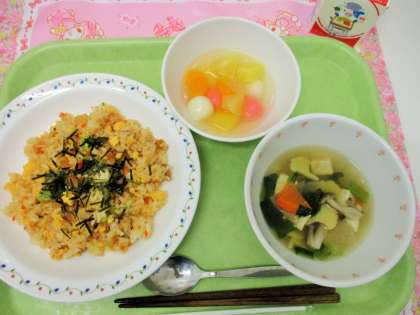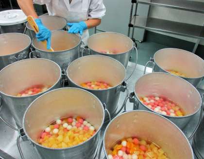 写真は、ちらしずしの具とご飯を混ぜあわせているところと、フルーツ白玉を配缶しているところです。