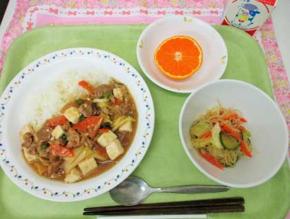 今日のサラダは、<春雨サラダ>です。酸味のあるドレッシングでしたが、子どもたちはよく食べていました。