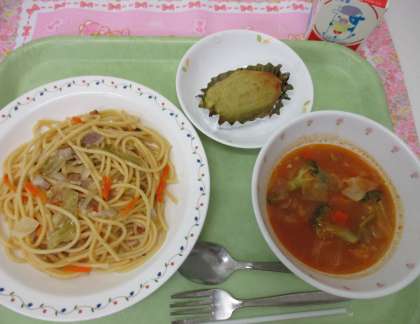 今日の給食は、”ほんでランチ”です。今日のおはなしは、「はらぺこニードル」です。おなかがぺこぺこの犬のニードルと、のっぽのコックさんのヌードルさんの素敵なおはなしです。このおはなしをイメージして、キャベツとベーコンのペペロンチーノを作りました。この本は学校の図書館にあります。ぜひ、読んでみてください。