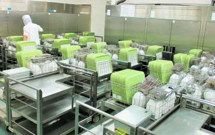 写真は、<肉豆腐>が完成したところと、ワゴンプールの様子です。各学級用に1台ずつ用意したワゴンに、食器やできあがった料理を入れた食缶をのせていきます。すべてのものがのっていることを確認し、エレベーターを使って、配膳室まで運びます。