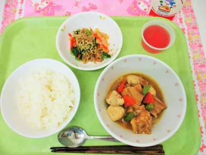 今日の給食は、<肉豆腐>です。たまねぎの甘みもあり、豆腐にしっかり味がしみていておいしく仕上がりました。今日のような煮物は、低学年用と高学年用に味の濃さを変えて作っています。