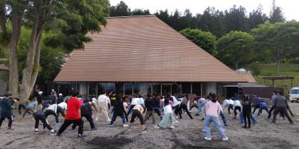 2日目のプログラムが始まりました。朝はひんやり涼しいです。昨日キャンプファイヤーをした広場で朝の会を行いました。
