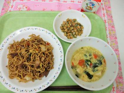 今日の給食は、<のり塩大豆>です。給食室でゆでた大豆に片栗粉をまぶし、油でかりっと揚げ、のり塩味に仕上げました。豆が苦手な児童でも食べやすいようで、とても人気があります。子どもたちは、お箸を上手に使って食べていました。