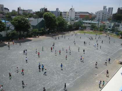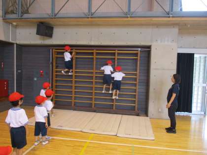 写真は、1年生体育「固定施設を使った運動遊び」と中休みの様子です。