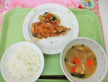 あさって6月11日は、入梅です。入梅とは、暦の上で梅雨の季節に入る日です。今日の給食はひと足早いですが、<入梅メニュー>にしました。梅雨の時期にとれるいわしを「入梅いわし」といい、一年の中で一番あぶらがのっていて、おいしいと言われています。今日は、かりっとなるように油で揚げ、給食室特製のたれをかけて、かば焼きを作りました。甘辛のたれで、白いご飯もすすみます。子どもたちは、今日もよく食べていました。