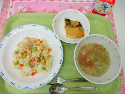 今日の主菜は、カレー粉の香りが食欲をそそる<タンドリーフィッシュ>です。タンドリーチキンは、鶏肉で作りますが、今日は鶏肉のかわりに青魚のさばを使い、おいしく焼き上げました。カレー味のものを食べると元気がでますね。