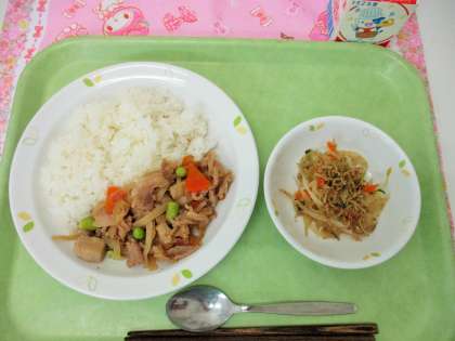 今日の給食は、<豚丼>です。豚肉には、体にたまった疲れのもとを取り除く栄養素がたっぷり入っています。豚丼をもりもり食べて、子どもたちには心も体も元気いっぱいに過ごしてほしいと思います。