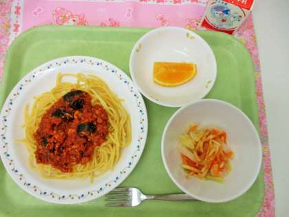 今日の給食は、<なす入りミートソーススパゲッティ>です。今日は、子どもたちが好きな給食室特製ミートソースに、夏が旬のなすを加えました。みじん切りの大豆や鶏レバーも入っているので、たんぱく質や鉄分もたっぷりで栄養満点です。