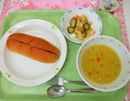 今日の給食は、<かぼちゃのクリームスープ>です。夏野菜のかぼちゃを使って、クリームスープを作りました。かぼちゃには、病気から体を守ってくれるカロテンがたくさん入っています。暑い日が続いていますが、もりもり食べて、元気に過ごしてほしいと思います。