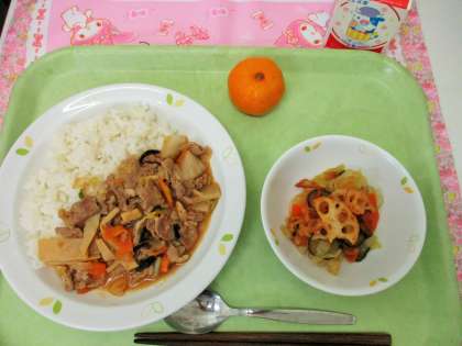 今日の給食は、<豚キムチ丼>です。給食で使用するキムチは、辛さのマイルドなものを使っています。キムチは韓国の漬物ですが、韓国ではそれぞれの家庭でキムチをつくることが多く、キムチをつくるための冷蔵庫もあるそうです。赤い色のものや、辛い味のものを食べると、体に元気がみなぎってきますね。まだ暑い日が続くようですが、もりもり食べてスタミナをつけてほしいと思います。