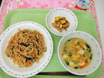 今日の<お豆かりんとう>は、素揚げしたさつまいもと給食室でゆでた大豆に片栗粉をまぶして油で揚げて、砂糖と豆乳で作った蜜をからめました。ほんのり優しい甘さで、おいしくできました。子どもたちも、もりもり食べていたので嬉しかったです。大豆には、良質なたんぱく質やカルシウムなどの栄養がたっぷり入っています。ぜひ、ご家庭でも作ってみてください。