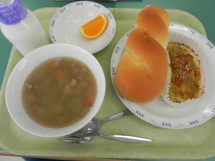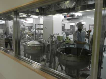 給食室は1階廊下に面していて、協立給食のスタッフの方々が調理している姿を見ることができます。