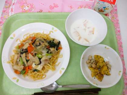 今日の給食は、<五目あんかけそば>です。今日は8種類の食材を使ってあんを作り、中華麺の上にかけました。具沢山で栄養満点です。今週末の運動会にむけて、もりもり食べて、スタミナを蓄えてほしいと思います。