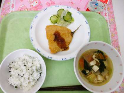 今日の主菜は、<アジフライ>です。アジは、味のよい魚だったので、「アジ」と名前がつけられたと言われています。少し大きめでしたが、子どもたちはよく頑張って食べていました。