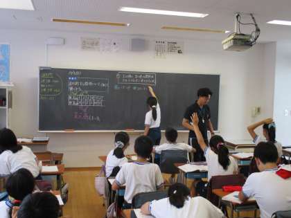 6年生「算数」では、反比例について式に表すなど二つの数量の関係について考えていました。