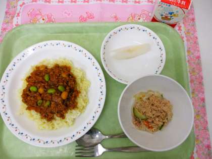 明日は待ちにまった運動会ですね。今まで練習してきた成果を発揮できるように、にっこり笑顔で取り組みましょう。今日の梨の品種は、栃木県産の<にっこり梨>です。食べると、にっこり笑顔になれますよ。からきた特製ドライカレーライスも、食べると元気いっぱいになれますね。今日は、どのクラスも本当によく食べていました。