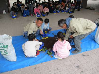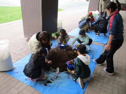5日(火)3・4時間目に1年生が、パンジーやチューリップの球根を植える学習を行いました。世田谷花卉園芸組合から4名のゲストティーチャーに来ていただきました。花や球根の植え方や育て方をしっかり聞いて活動していました。