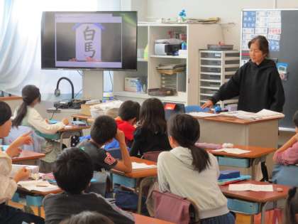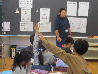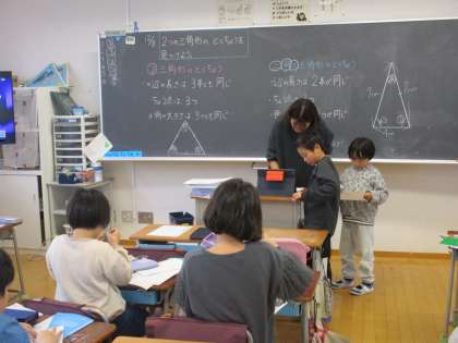 3年算数、4年国語の学習の様子です。3年算数では、辺の長さや角の大きさに着目して、正三角形や二等辺三角形の特徴を調べる学習をしていました。