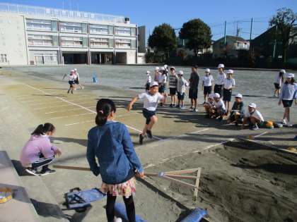 3年国語、5年国語、5年体育の学習の様子です。5年体育では、走り幅跳びの行い方と計測
