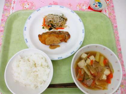 今日のごはんは、有機米のごはん(千葉県産の粒すけ)です。つやがあって、おいしいお米でしたね。今日も、よく食べていました。