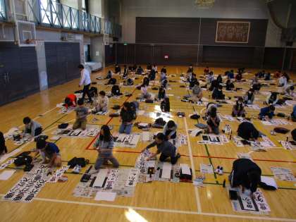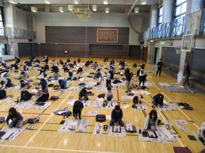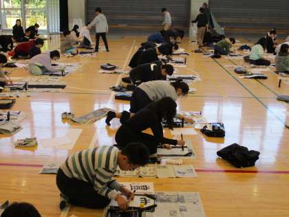 1月10日1,2時間目に体育館で5年生が書初めを行いました。毛筆を使用して、穂先の動きと点画のつながりを意識して「豊かな心」を書いていました。