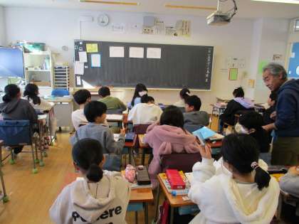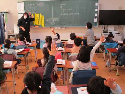 1年算数、5年算数、6年社会の学習の様子です。1年算数では、ブロック図を活用して、十の位、一の位に気を付けて数を数えていました。