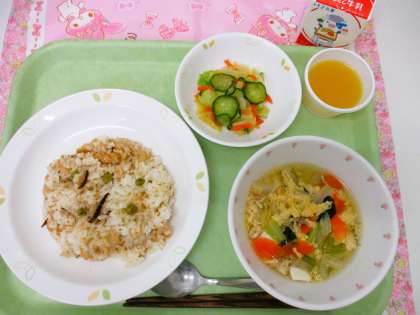 今日の主食は、<いなりごはん>です。給食室でいなりずしを作ることが難しいため、甘辛く煮た油揚げや具材を酢飯とあわせました。
