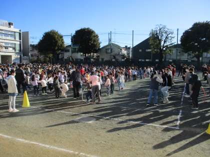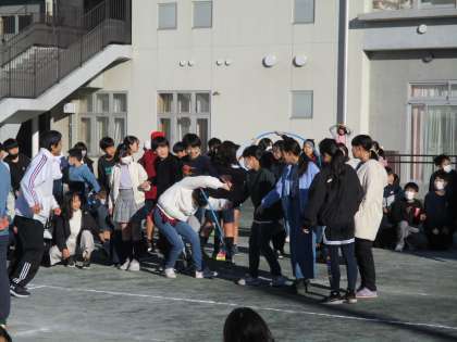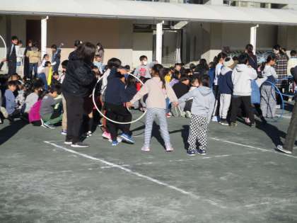 1月25日に校庭で児童集会がありました。寒い朝の時間帯でしたが、フラフープ送りをして楽しみました。