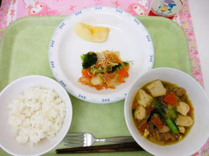 今日の給食の副菜は、<ブロッコリーとじゃこの中華和え>です。ブロッコリーは緑黄色野菜で、主に花のつぼみの部分を食べています。ブロッコリーの茎もかたい部分を取り除くと、捨てずに食べられます。ビタミンCやカロテンが特に多く、その他にも鉄やカルシウムも豊富に含まれています。ブロッコリーは、好きな子どもたちも多いようですね。どの学級もよく食べていました。