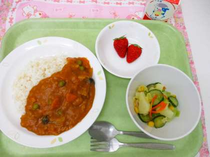 今日のいちごは、静岡県産の紅ほっぺという品種です。いちごは、先端の方が甘いので、食べる時にはへたの方から食べると、最後に甘みをたっぷりと感じられておいしくいただけます。いちごには、風邪を予防してくれるビタミンCが豊富に含まれています。子どもたちは、いちごに大喜びでした。