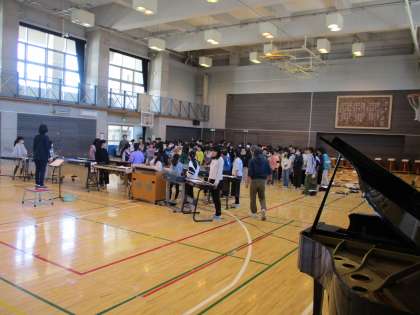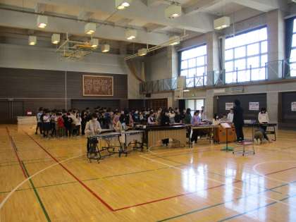 5年生が体育館に集まって、6年生を送る会で披露する合奏の練習をしていました。