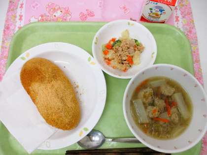 今日は、子どもたちに大人気の<きなこ揚げパン>です。今日は、国産小麦粉でつくられたコッペパンを使用しました。外はからっと、中はふわふわのおいしい揚げパンに、子どもたちは大喜びでした。<きなこ揚げパン>は、夢の給食アンケートで1〜3年生・6年生では主食部門1位、4・5年生では2位でした。