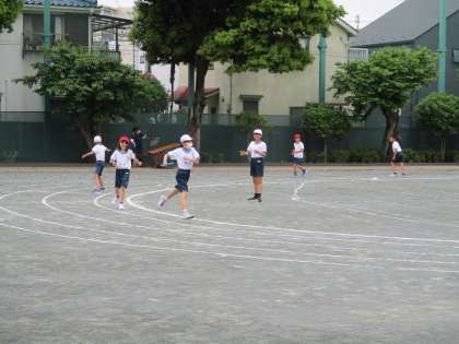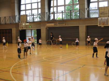 5年体育、3年体育、4年音楽の学習の様子です。5年体育では、滑らかなバトンの受渡しをめあてにして学習に取り組んでいました。