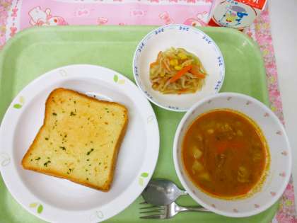 今日のスープは、<ボルシチ>です。ボルシチは、ロシアの伝統料理で、世界三大スープの一つと言われています。ロシアでは、各家庭によって、材料や味付けが異なり、日本でいうみそ汁のようなイメージだそうです。本来は、ビーツという赤かぶに似た野菜を使って、赤い色に仕上げますが、給食ではトマトを使って、赤い色に仕上げています。今日は、大豆も加えて煮込んでいますので、さらに栄養たっぷりです。