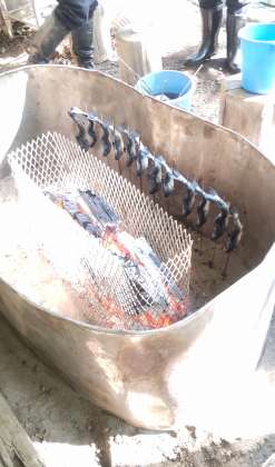 とったマスは、その場でさばかれて、炭火で焼いていました。