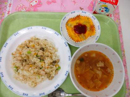 今日の主食は、<鶏ごぼうピラフ>です。ごぼうは、野菜の中でも特に食物せんいがたっぷりで、おなかの調子をよくしてくれます。子どもたちには、ごぼうの食感や香りを楽しみながら食べてほしいと思っています。