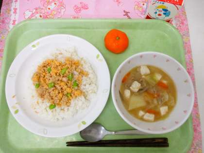 今日の給食は、<三色丼>です。鶏ひき肉と高野豆腐で作った肉そぼろと、いり卵・枝豆をあわせたものをご飯にかけていただきます。今日のお米は、栄養豊富で食べやすい七分つき米(岩手県産ひとめぼれ)を使っています。