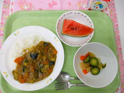 今日のカレーライスには、素揚げした夏野菜(なす・かぼちゃ・ズッキーニ)が入っています。素揚げすることにより、野菜の甘みがひきたち、コクも感じられます。野菜が苦手な子にも、食べやすくなるようです。